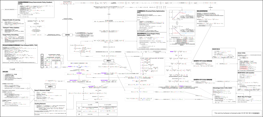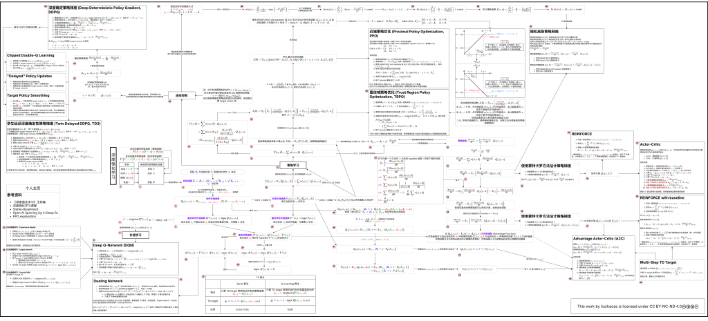 同时,本图还展示了深度强化学习中大部分算法的数学推导以及训练方法,包括: